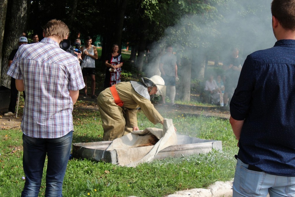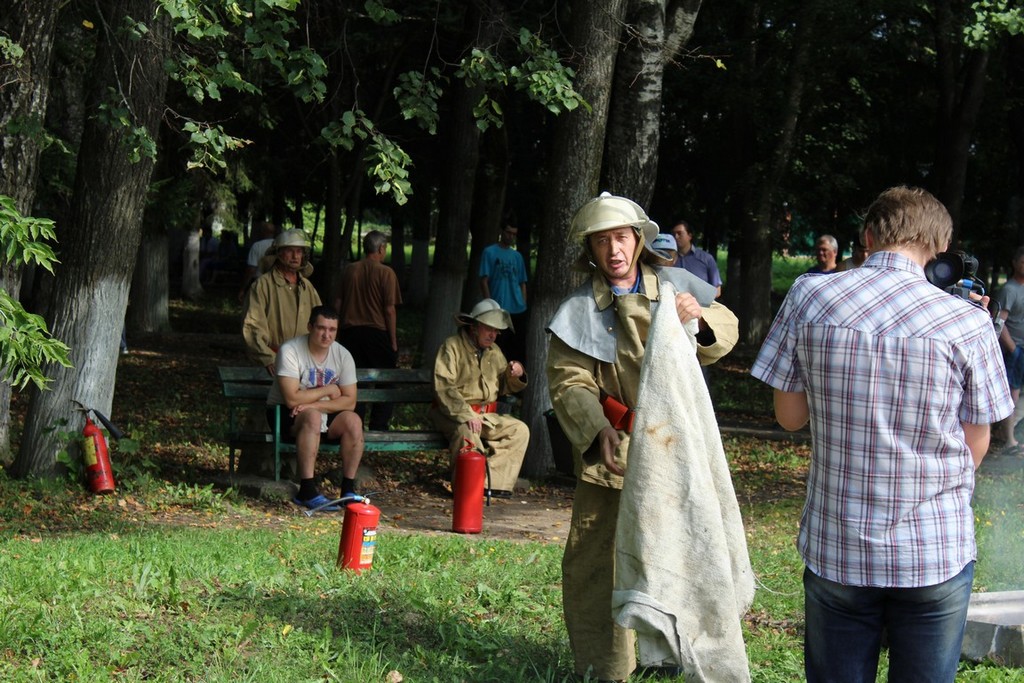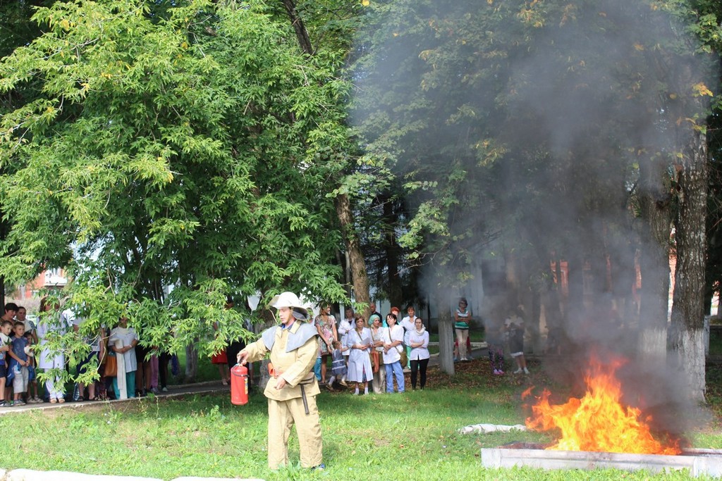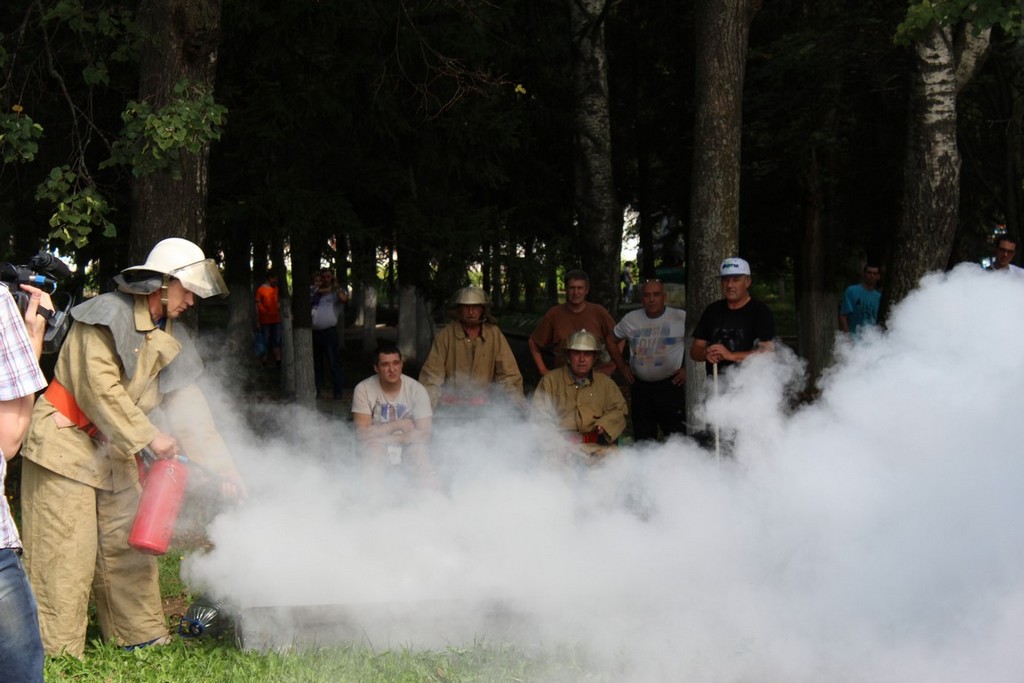 Добровольная пожарная команда успешно продемонстрировала приемы тушения очага пожара порошковым огнетушителем и кошмой.