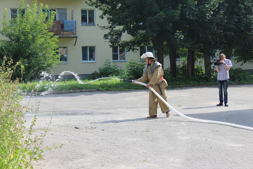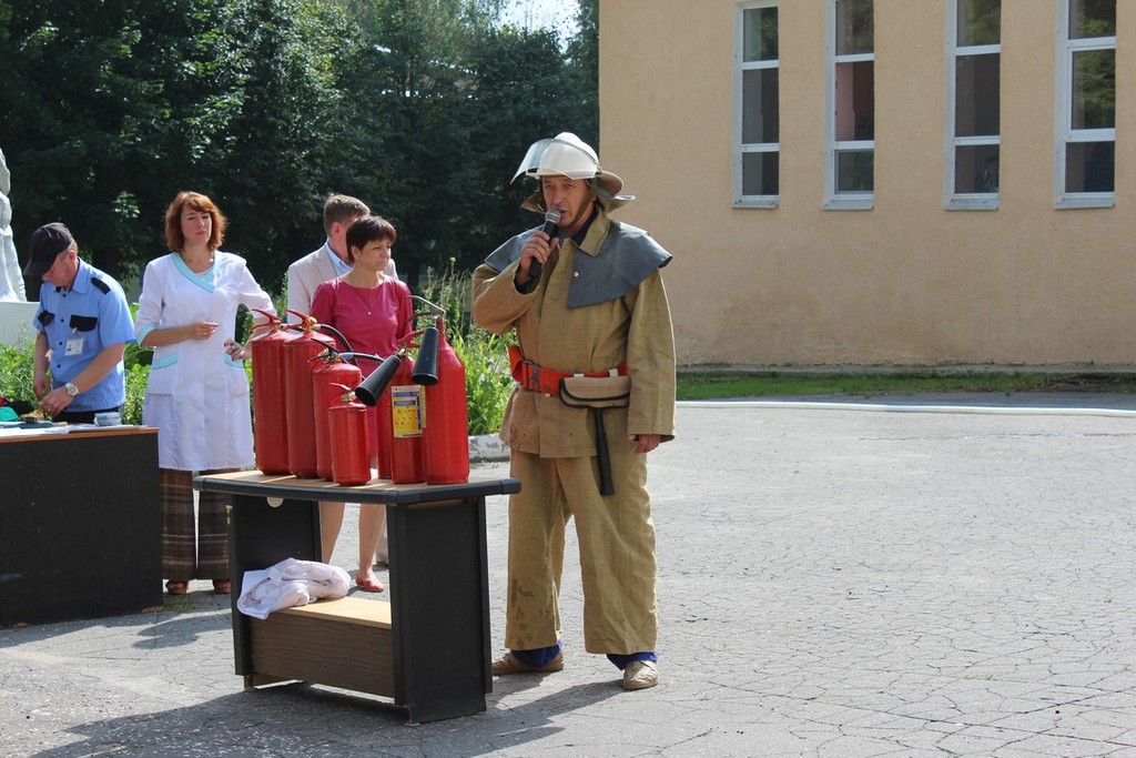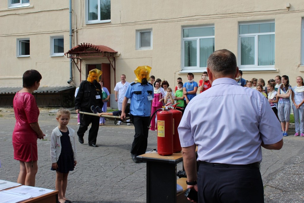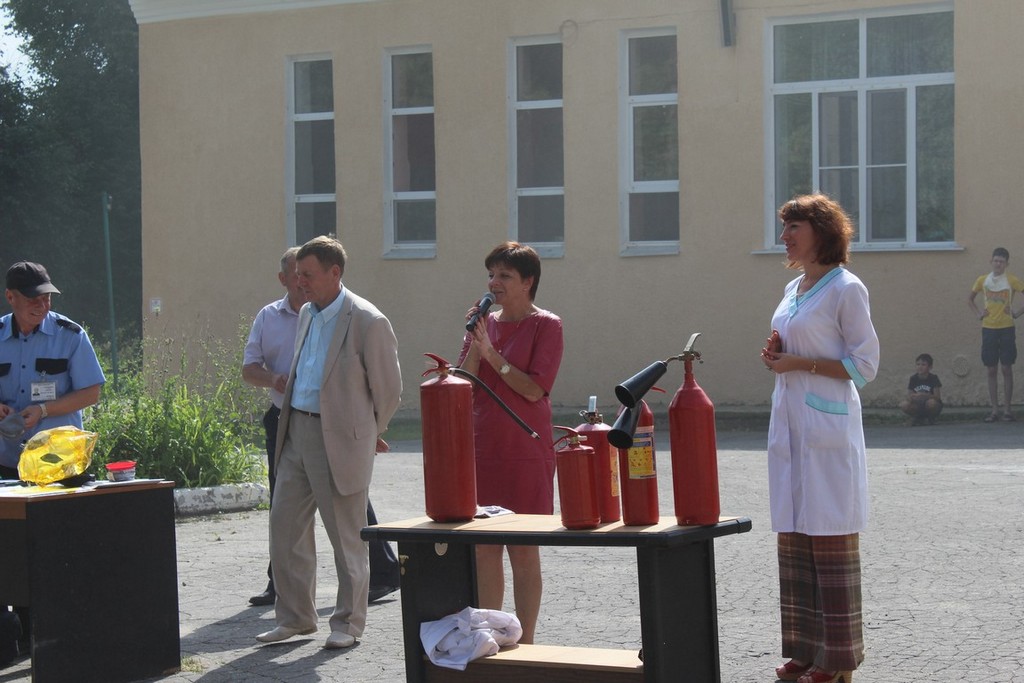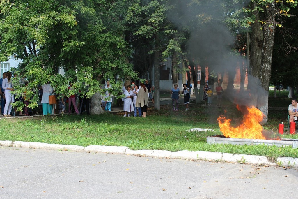 Добровольная пожарная команда успешно продемонстрировала приемы тушения очага пожара порошковым огнетушителем и кошмой.