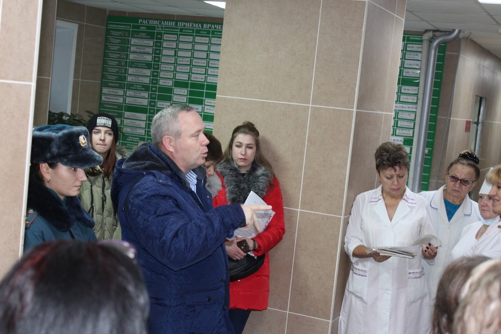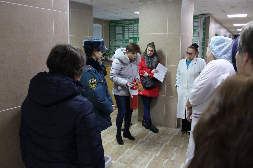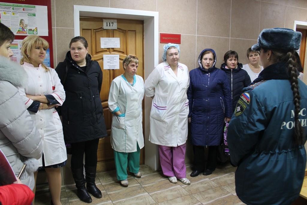 Инспектор отделения профилактики пожаров Юлия Авдеева подробно рассказала присутствующим об основных требованиях пожарной безопасности в лечебных учреждениях, действиях персонала на случай возникновения пожара. Для работников больницы, которые работают и в ночное время, Юлия пояснила, что основная сложность, с которой они могут столкнуться в случае возникновения пожара – эвакуация пациентов. Поэтому работникам крайне необходимо чётко знать и соблюдать весь алгоритм действий в случае возникновения пожара. Медицинскому персоналу также пояснили, что на каждом этаже должны иметься средства индивидуальной защиты и переносные устройства для пациентов, которые самостоятельно не могут передвигаться.