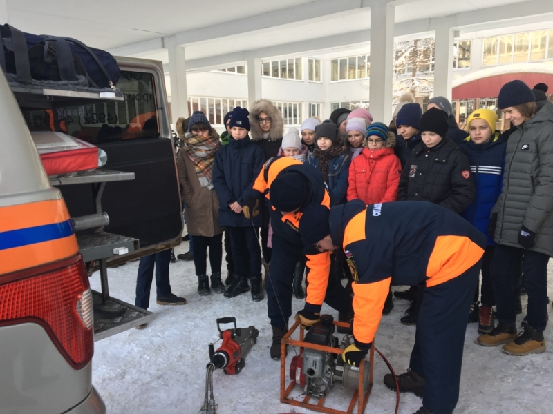 Пожарные и спасатели нередко выполняют совместные работы, помогая друг другу. Представители аварийно-спасательного формирования рассказали ребятам, что они также пребывают на пожары в зданиях, (при повышенных рангах пожаров) для спасения людей и оказания им первой медицинской помощи. Кроме этого спасатели зачастую привлекаются для ликвидации последствий техногенных происшествий на различных объектах и на ликвидацию последствий дорожно-транспортных происшествий. Школьникам показали, какие медицинские препараты входят в чемодан неотложной помощи, какие гидравлические инструменты используются при проведении спасательных работ и как они работают.