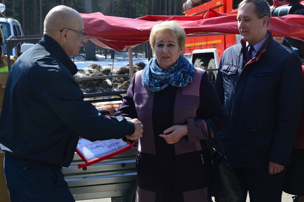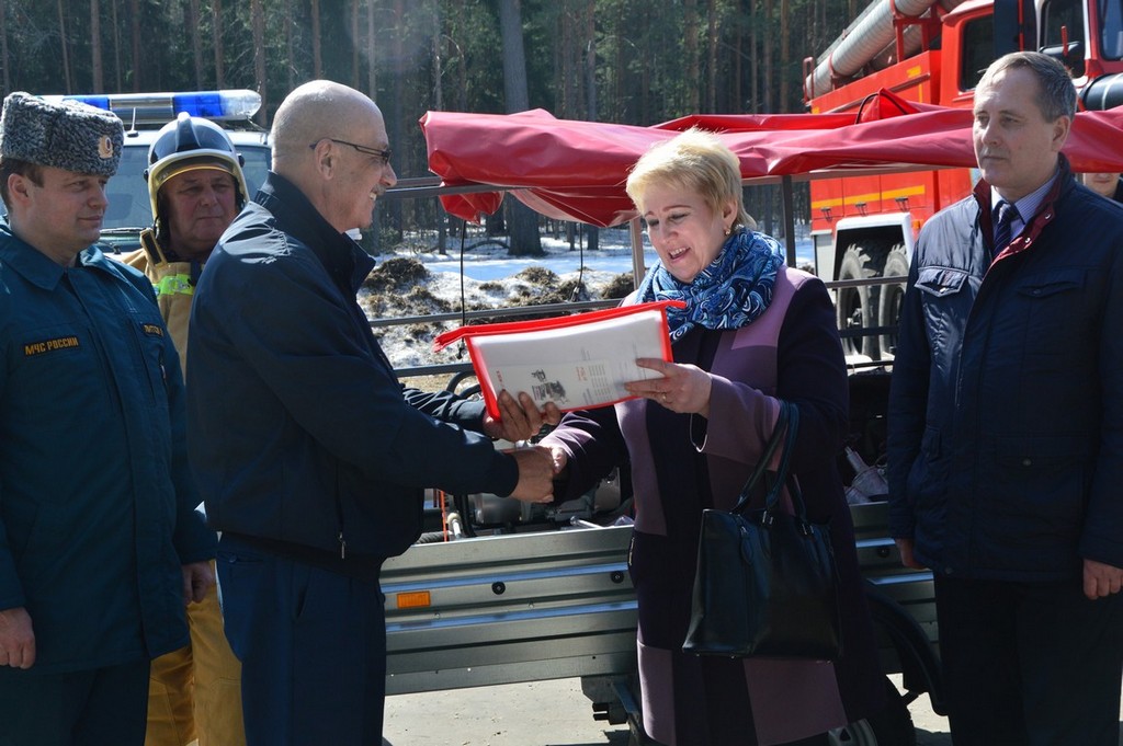 В завершении смотра председатель областного отделения ВДПО Владимир Николаевич Чернов в торжественной обстановке вручил в безвозмездное пользование мобильный пожарный пост главе Демидовского сельского поселения Гусь-Хрустального района Суворовой Светлане Владимировне.