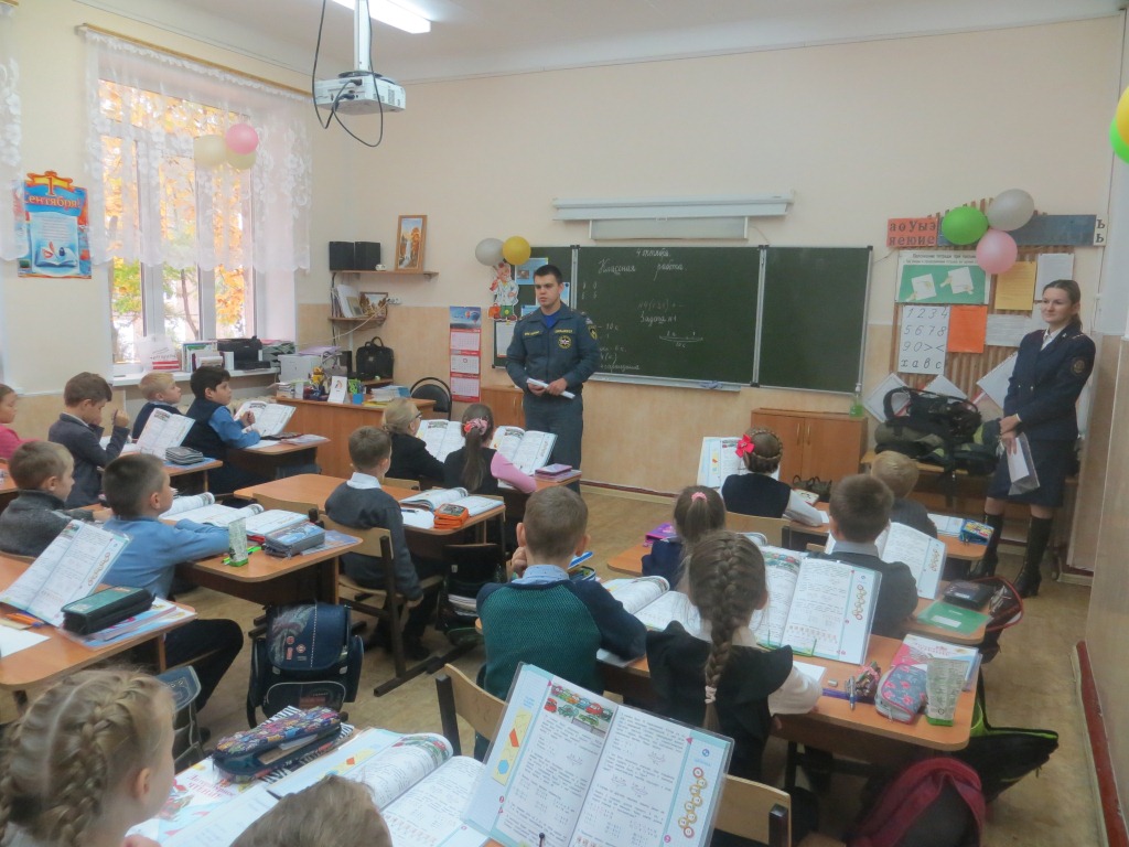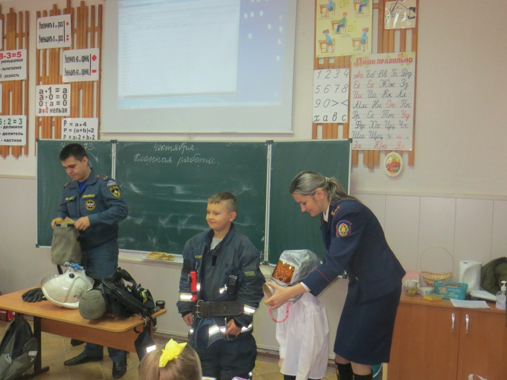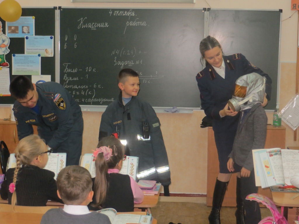 Во второй части урока школьникам рассказали о правилах пожарной безопасности, которые необходимо соблюдать в быту в осенне-зимний период. Ученикам вторых классов выдалась возможность примерить на себя боевую одежду пожарных. Все ребята показали отличные знания в области безопасности. В финале ребята поблагодарили организаторов за интересную беседу. Инспектор ВДПО раздала ребятам и учителям памятки.