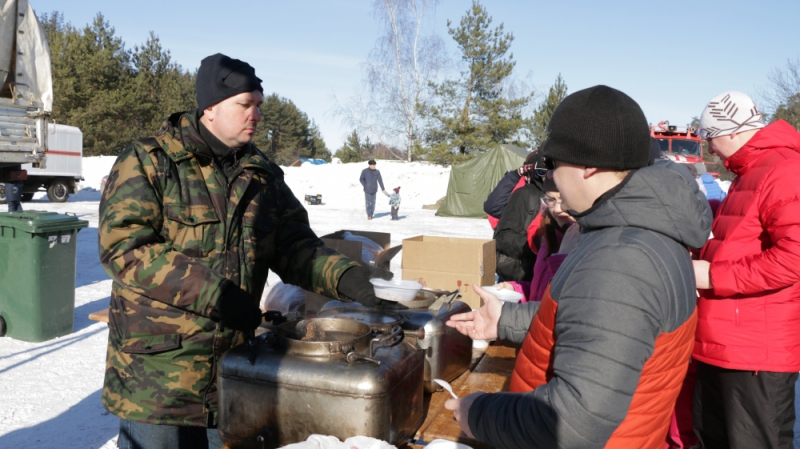 Далее участники мероприятия смогли познакомиться с представленной на площадке пожарно-спасательной техникой, поучаствовать в конкурсе по надеванию на время боевой одежды пожарного, отведать в полевой кухне горячей каши и чаю.
