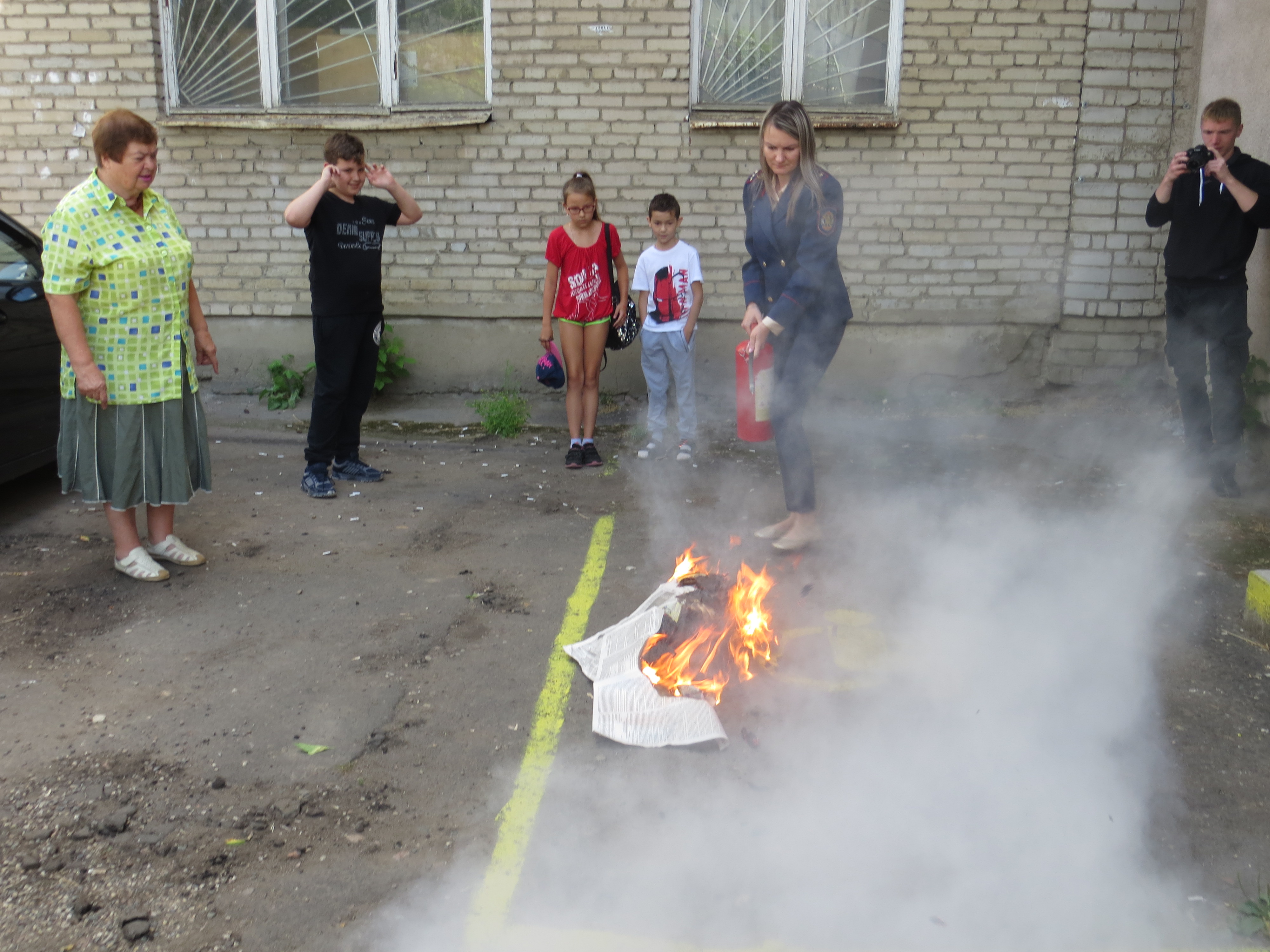 Инспектор ВДПО рассказала детям о том, какие бывают огнетушители и как ими пользоваться. На улице каждый смог попробовать потушить условный очаг возгорания.