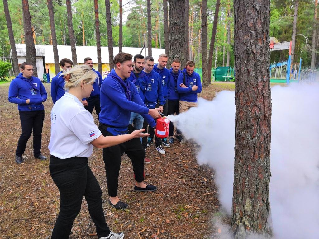 Представитель добровольного пожарного общества провела с руководителями отрядов практическую тренировку по использованию первичных средств пожаротушения, таким как огнетушитель.
