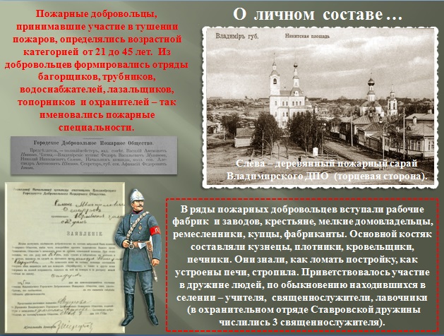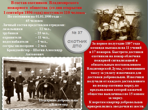 С образованием в городе ДПО этот отряд огнеборцев был значительно пополнен. Вскоре добровольные команды и дружины начали создаваться и в других городах губернии: Александрове, Коврове, Переславле, Суздале и других городах.