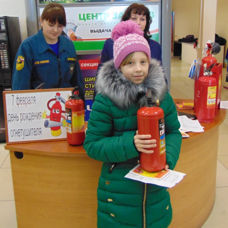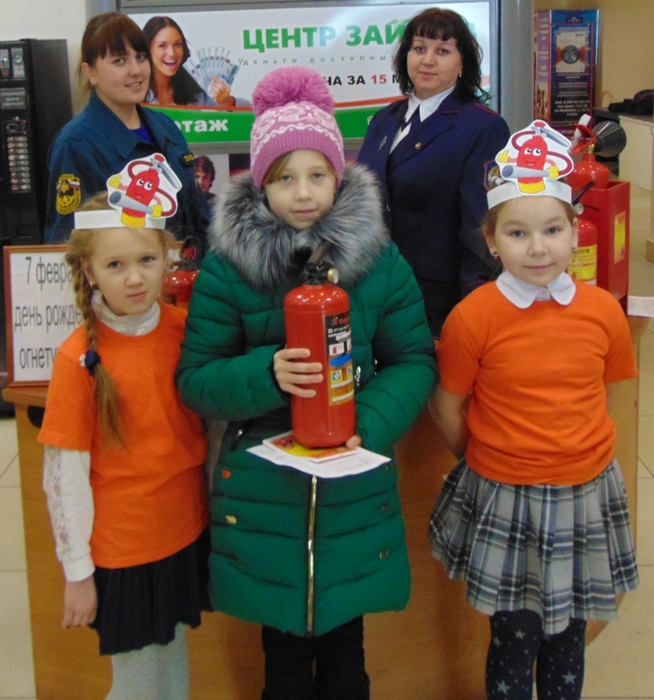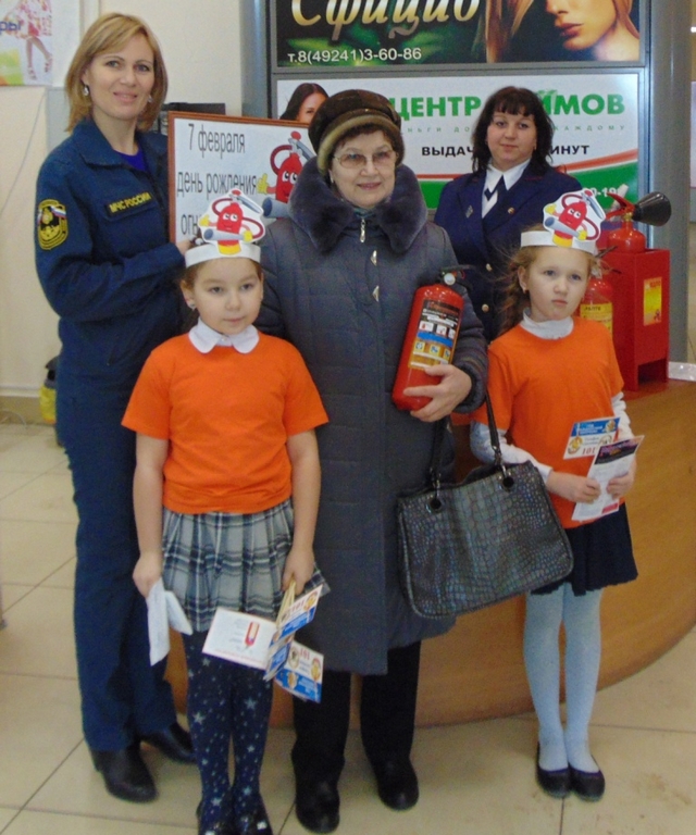 Разучив несколько весёлых рифмованных фраз о средствах пожаротушения и надев специальные костюмы в виде маленьких огнетушителей они подходили к посетителям торгового центра, приглашали на тест об истории возникновения огнетушащих ручных средств и вручали флажки и маленькие призы на память.