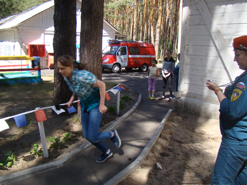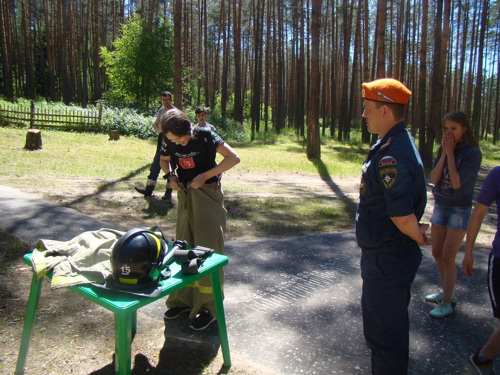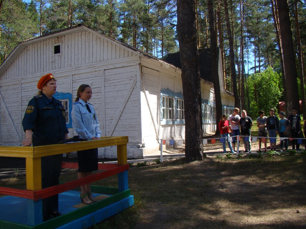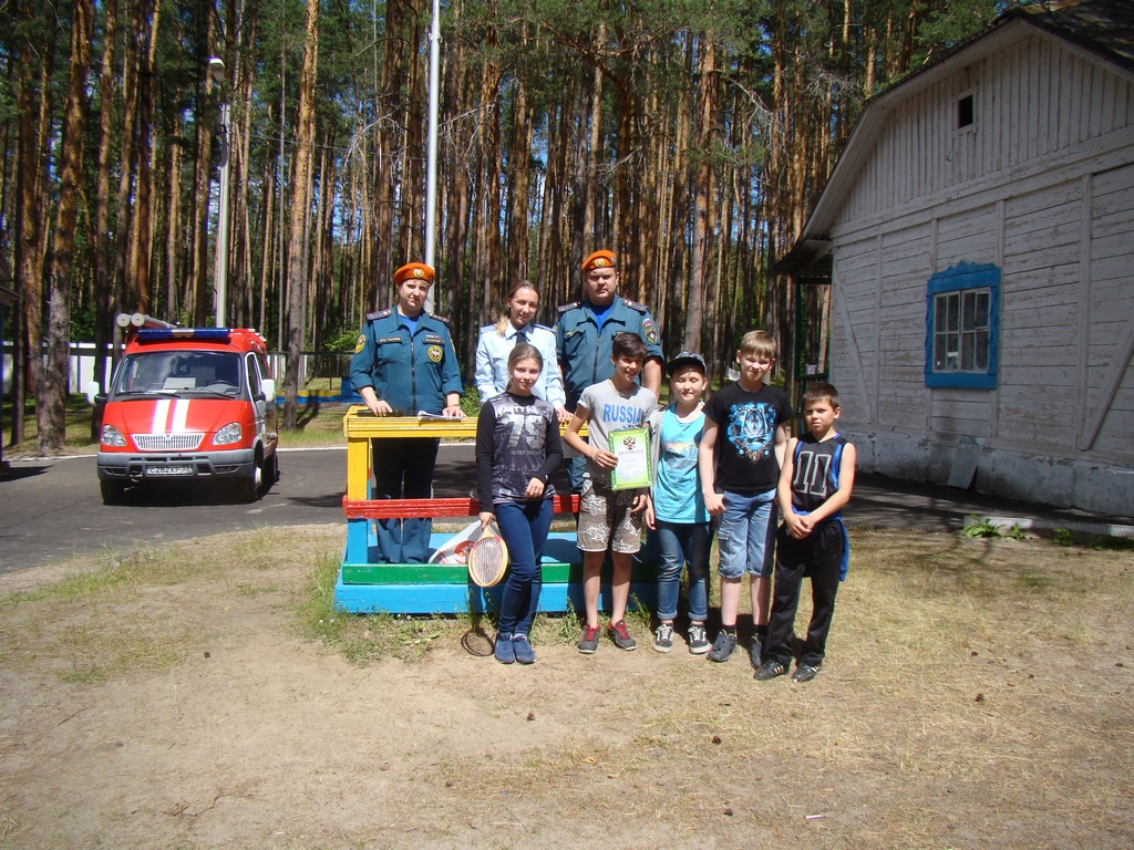 Сотрудники ВДПО и МЧС провели с детьми беседу по пожарной безопасности, пообщались с руководством и персоналом лагеря, организовали пожарную эстафету, провели викторину.