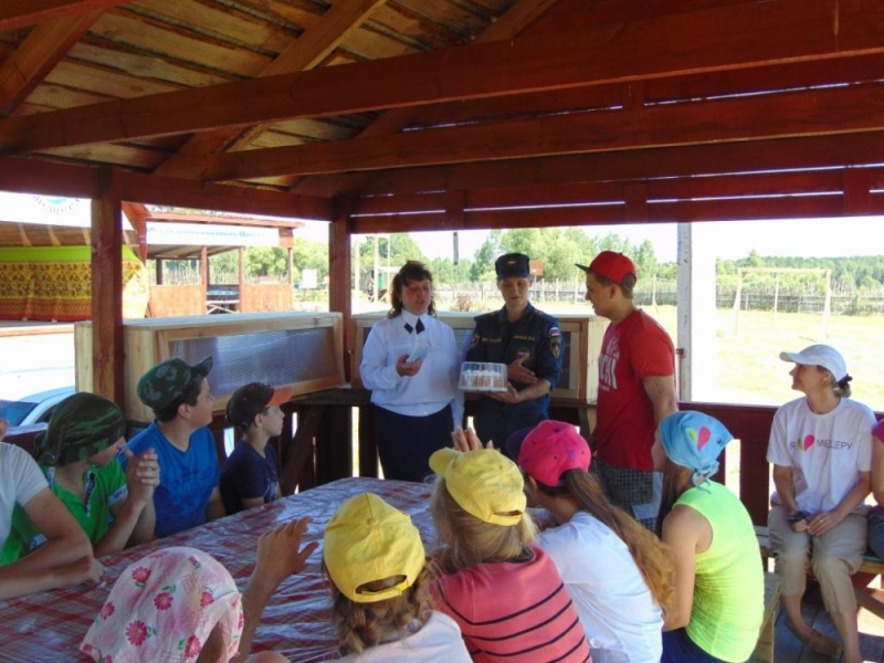 После окончания соревнований, и гости, и участники собирались на просторной веранде. Сотрудники МЧС и ВДПО навещали ребят не с пустыми руками. Они дарили детям блокноты и сладкие призы.